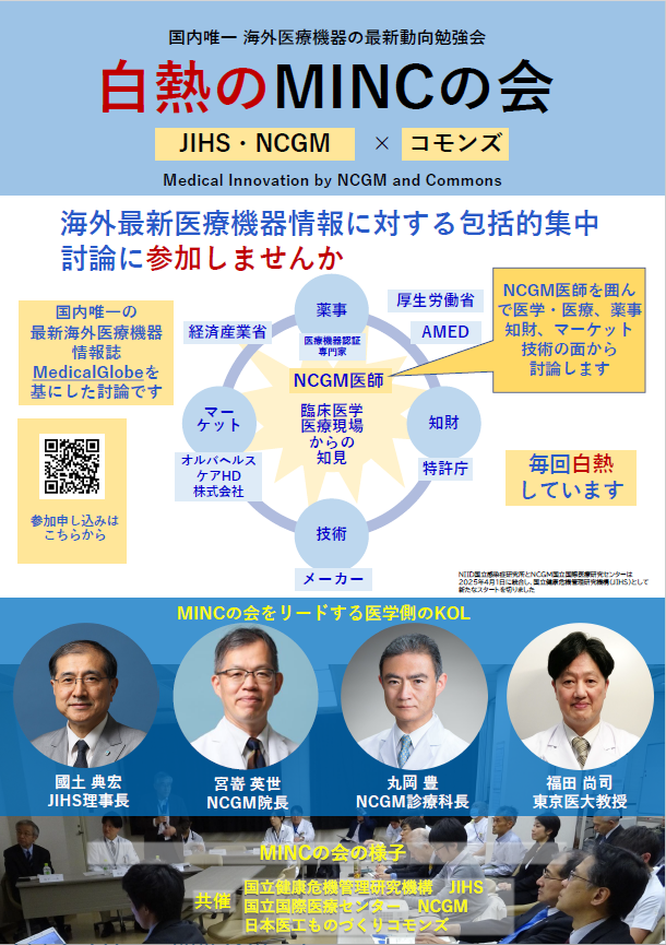 日本医工ものづくりコモンズでは、国立健康危機管理研究機構(旧:国立国際医療研究センター)と正式に提携して、医療機器開発に関する交流を目的とした海外医療機器最新動向勉強会(MINCの会(Medical Innovation by NCGM and Commons))を開催しています。