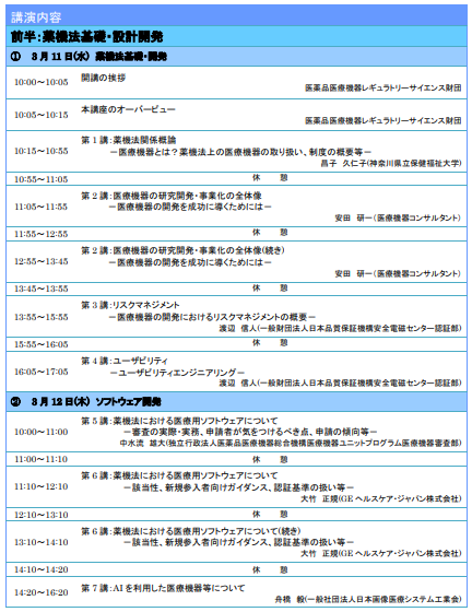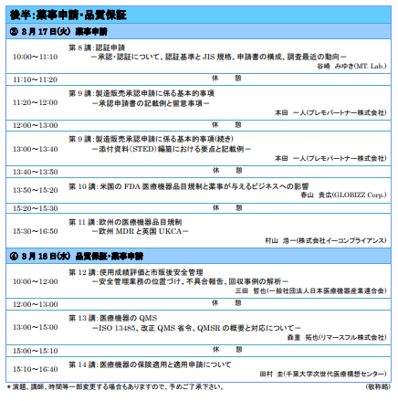 今年度も、前半2日間を「薬機法基礎・設計開発編」、後半2日間を「薬事申請・品質保証編」とする計4日間のコースといたしました。