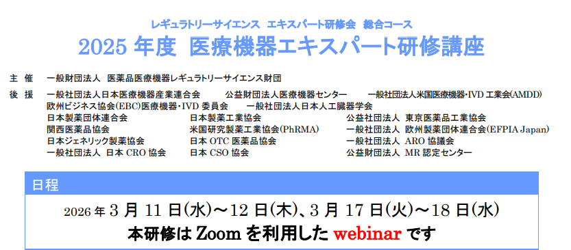 (一財)医薬品医療機器レギュラトリーサイエンス財団では、「2025 年度 医療機器エキスパート研修講座(総合コース)」を下記の要領で開催いたします。